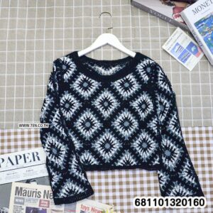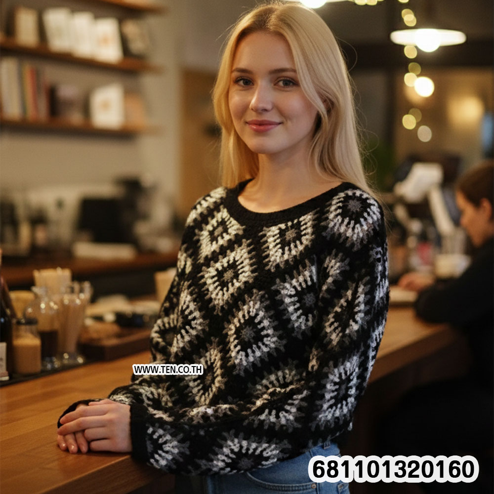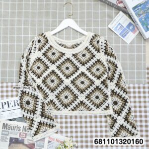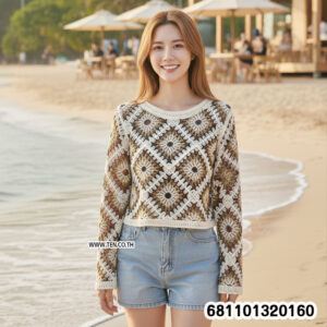 เสื้อโครเชต์แขนยาวดีไซน์ลายข้าวหลามตัด ให้กลิ่นอายแฮนด์เมดผสมโบโฮวินเทจ เนื้อถักโปร่งใส่สบาย ระบายอากาศดี เหมาะสำหรับแมตช์กับกางเกงยีนส์ กระโปรง หรือใส่คลุมทับลุคซัมเมอร์และรีสอร์ต เพิ่มเสน่ห์แบบ effortless chic ได้ทุกวัน