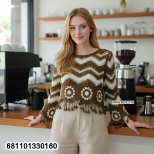 เสื้อโครเชต์แขนยาวลายซิกแซกสไตล์เรโทร ดีไซน์ถักโปร่งให้ลุควินเทจผสมโบโฮ ใส่แล้วดูมีเสน่ห์ ไม่ร้อน เหมาะกับซัมเมอร์และการเลเยอร์กับสายเดี่ยวหรือบิกินี่ ชายเสื้อและลวดลายช่วยเพิ่มมิติให้ลุคดูโดดเด่น ใส่เที่ยว ทะเล คาเฟ่ หรือรีสอร์ตได้สบายๆ