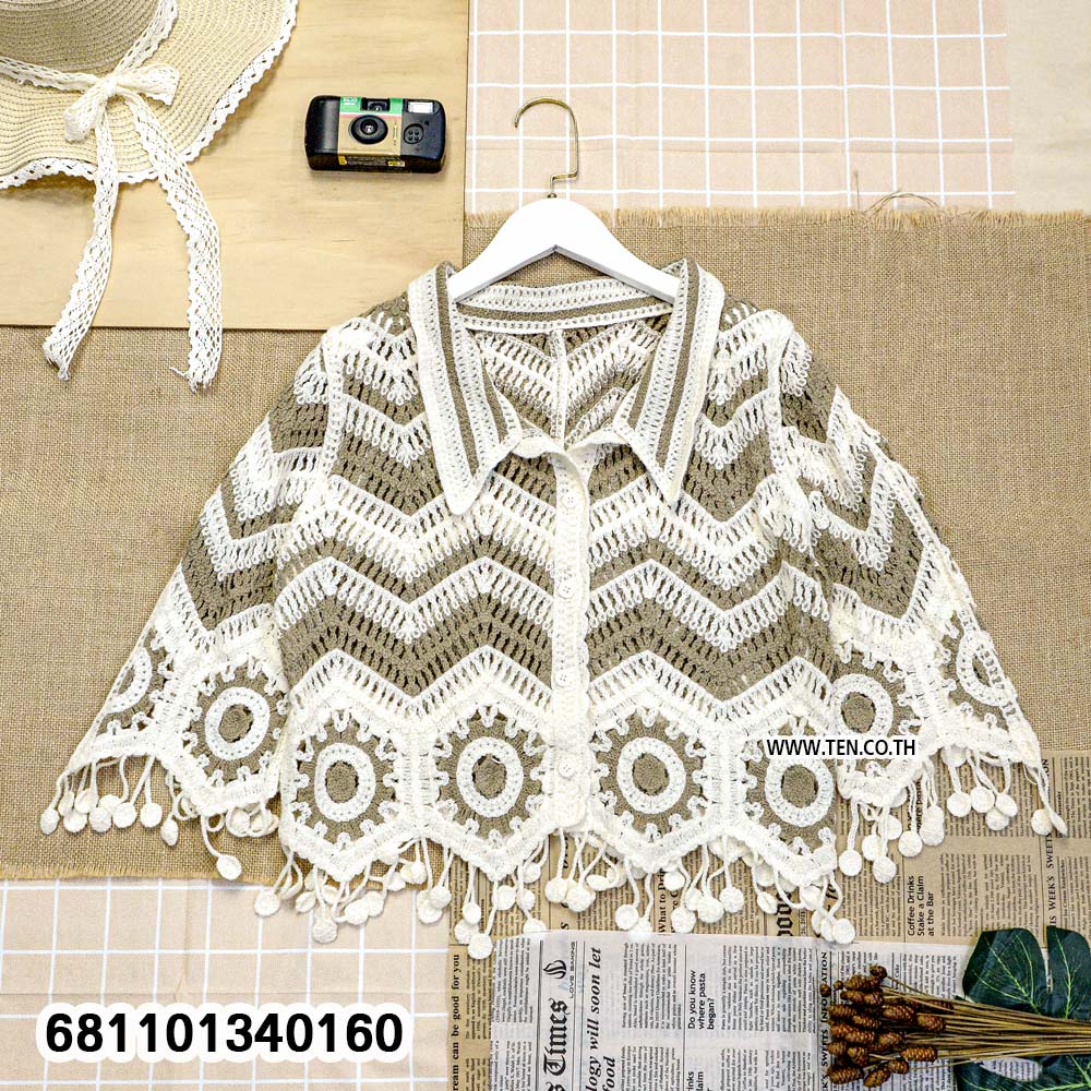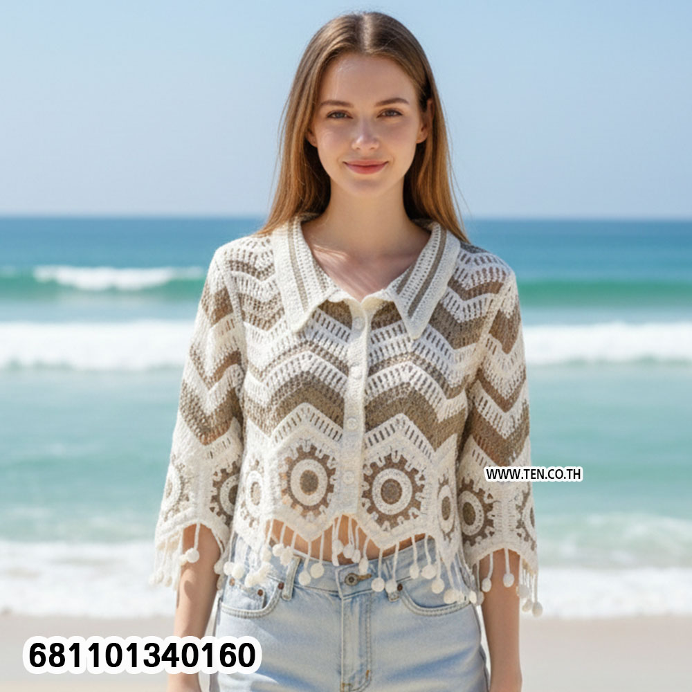 เสื้อโครเชต์ดีไซน์แฮนด์เมด ลายถักสวยโดดเด่น ชายเสื้อแต่งพู่ เพิ่มลูกเล่นแบบโบโฮวินเทจ ใส่สบาย โปร่งเบา เหมาะกับวันชิลๆ เที่ยวทะเล คาเฟ่ หรือแมตช์กับกางเกงยีนส์ก็เก๋ไม่ซ้ำใคร